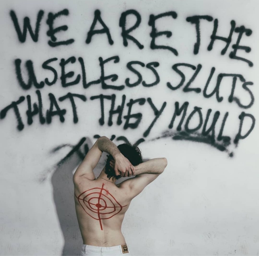 The image for the track has a tasty Richey Edwards vibe with Ian shirtless, sporting striking scribbled body slogans. This is the ironic conundrum for me. If we show some spark, we become aspirations for others and so the very force of being anti establishment (for example) becomes subsumed into the original problem. As Ian says “We’ve got bodies to sell, so we might as well“. Hahaha, I speak as a person with a spare room filled with 45 years of indie vinyl.