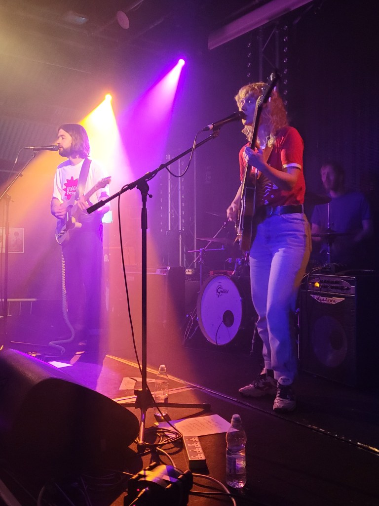 The Bug Club music has a simple intense sound, really a pounding rhythm and beat and an almost apologetic, sardonic vocal on top from Sam Willmett (guitar) and Tilly Harris (bass). The male and female vocal often intertwine with Sam taking on most on verse, and Tilly often joining in for chorus. Dan Matthew completes the trio on drums and he also on this night ran the merch store, with a burning trade in flexi- disks with hand drawn sleeves, and chatting with rather drunk elderly punters (OK that would be me).